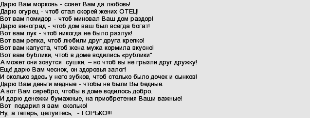 - Ви можете покласти на стіл молодим цегла, зі словами: «Перший цеглу для будівництва будинку і сімейного щастя. А якщо чоловік не буде радувати дружину – так і в якості виховання згодиться». Це викличе сміх, але якщо ви заздалегідь подбаєте, і замовте індивідуальний цегла з іменами нареченого і нареченої, а також датою і часом весілля – це вже подарунок зі змістом, який збереже на довгі роки.